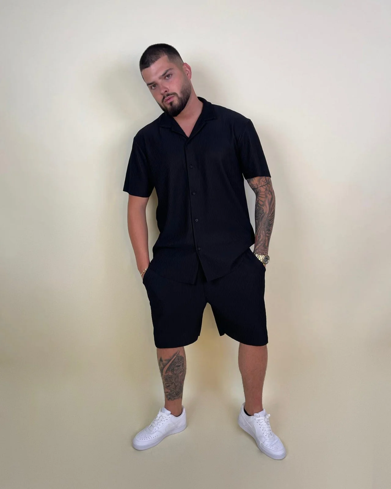 Kemishe shadow per meshkuj, me nje nuance te erret qe terheq si magnet dhe nje prerje te paster, kjo pjese misheron fuqine e heshtur.